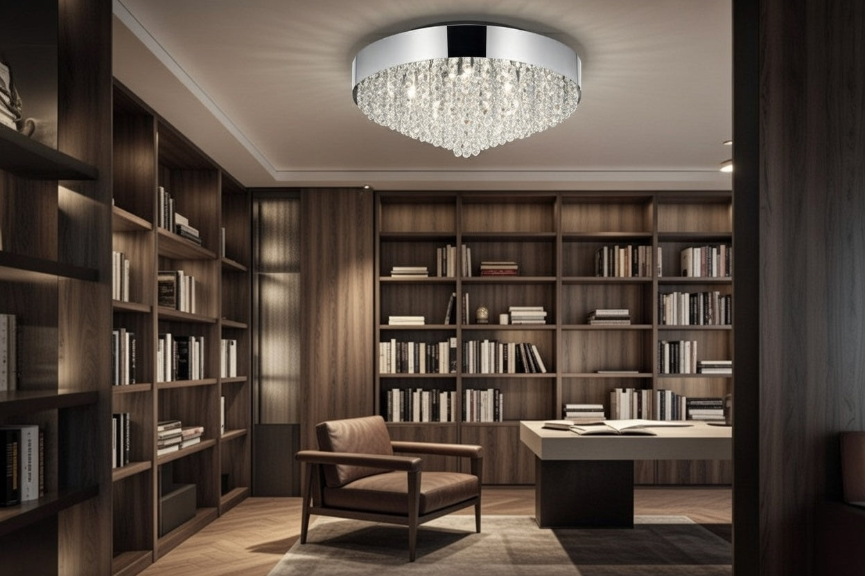 Clear crystals sparkle under a wide chrome-finished round shade in this elegant flush-mount chandelier. This stunning piece adds drama, chic, and sophistication to any style and room.