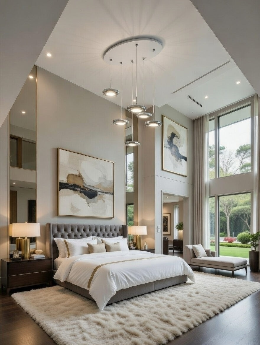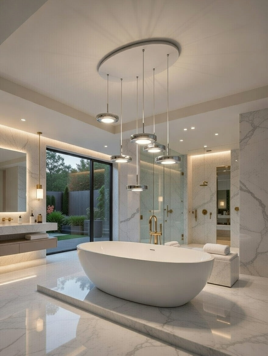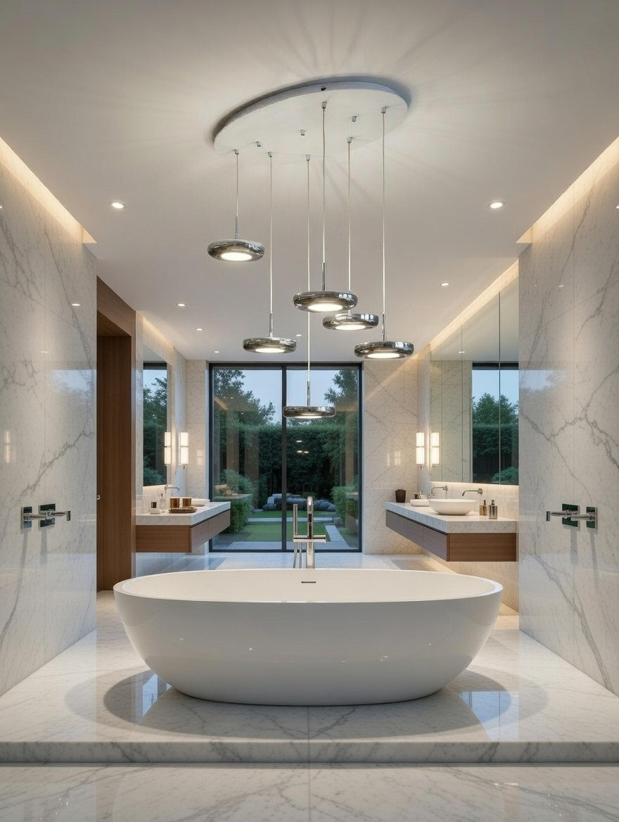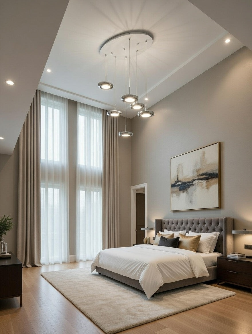 Minimalist Canvas: The slim, oval canopy mounts flush to the ceiling, ensuring the focus remains entirely on the elegant, cascading cords and luminous discs.